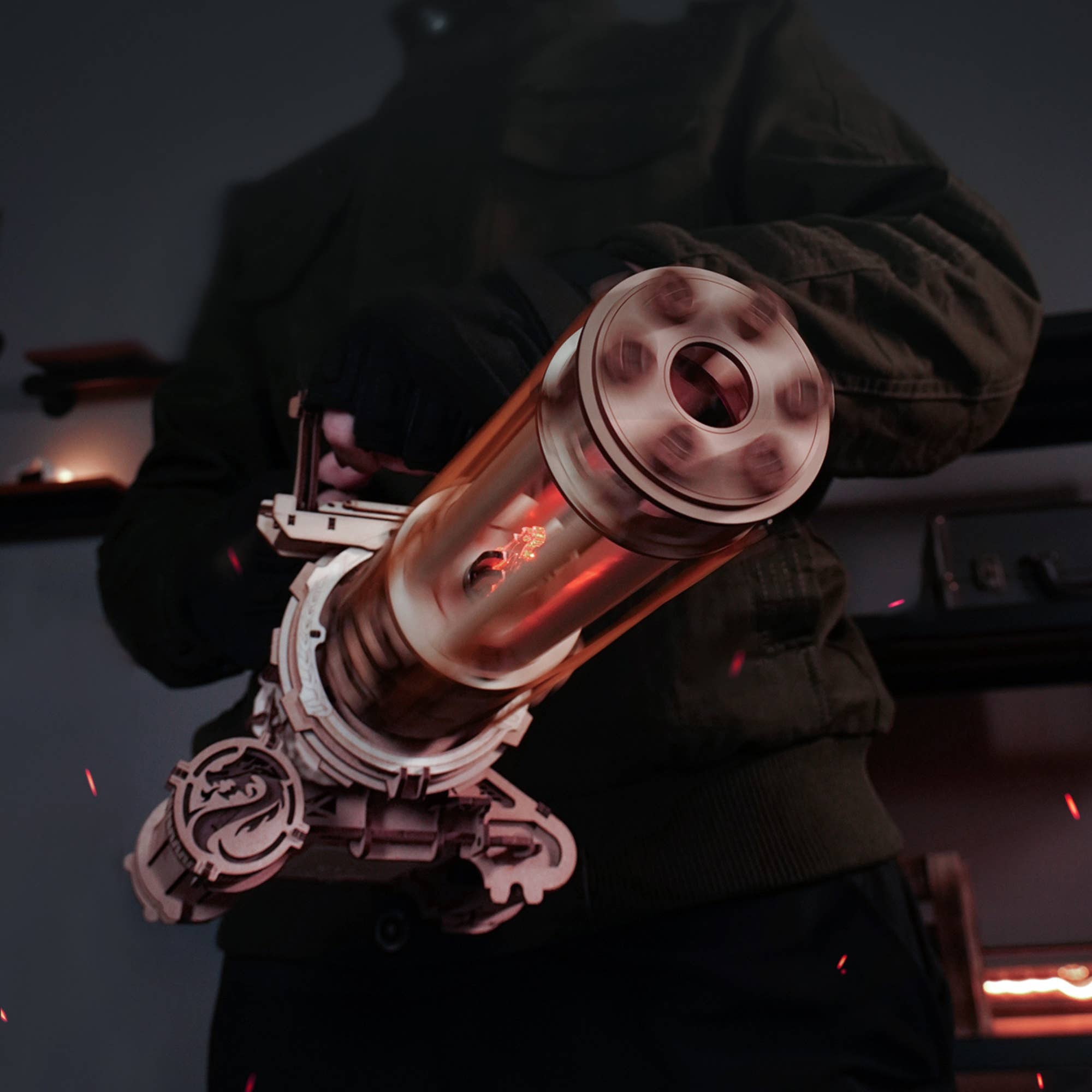 Ready, build, aim, shoot! Get your adrenaline pumping with this rotating, clicking, and firing 2-handed weapon from your fantasies! The ROKR Rotating-Barrel Machine Gun is a 3D wooden puzzle gun whose highlight is six rotating barrels that can shoot six rubber bands each. That's 36 high-speed shots you can load on the detachable rotating barrel assembly. Inspired by the XM556, this thing of beauty teaches fans a thing or two about the mechanics of rotary machine guns without the massive weight. It also avoids hurting living targets by utilizing rubber bands as bullets. Be your own action hero and order yours today! The package includes a set of wood sheets with 415 precisely laser cut pieces that assemble together to form your own rubber band gun. Assembled size (approx) : 17.7" x 6.4" x 8.3"